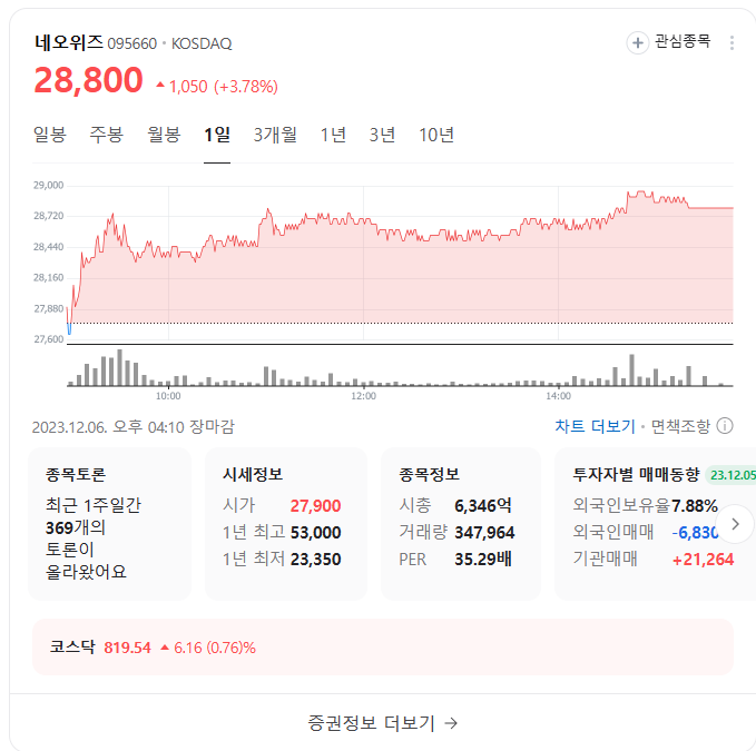 이 글에서는 네오위즈 주가 전망과 목표 주가, 기업 정보에 대해서 설명합니다. 주식 시장에서 핵심은 미래의 기업 가치를 예측하고 선제적으로 움직이는 것입니다. 투자할 종목을 선택하기 전에 현재 기업의 현황과 데이터를 확인하는 것이 필요합니다. 네오위즈 주식의 주요 현황과 투자 정보를 확인하시고 주식 투자에 도움을 줄 자료들을 모아 두었으니 투자 결정에 도움을 받으시길 바랍니다.