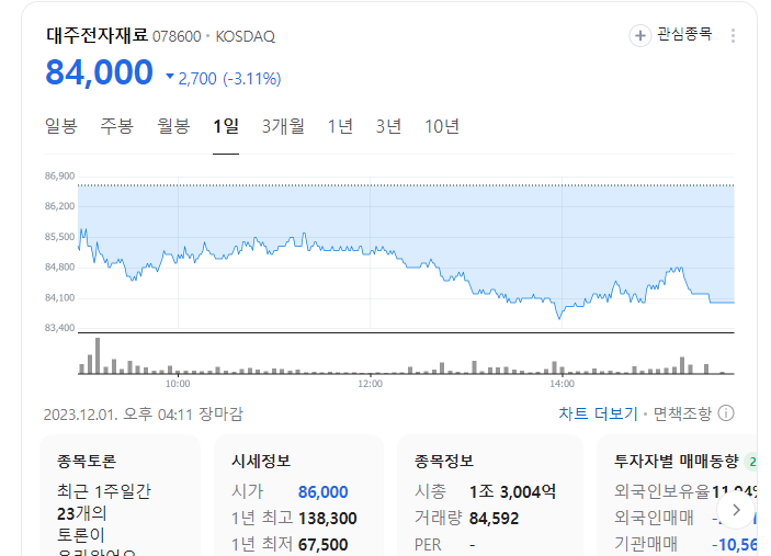 이 글에서는 대주전자재료 주가 전망과 목표 주가, 기업 정보에 대해서 설명합니다. 주식 거래에서 중요한 부분은 현재 기업 가치보다는 미래의 기업 가치를 예측하고 먼저 행동하는 것입니다. 투자할 종목을 고르기 전에 현재 기업의 상황과 지표를 살펴보는 것이 중요합니다. 대주전자재료 주식의 주요 현황과 투자 정보를 확인하시고 주식 투자에 유용한 자료들을 정리하여 제공하오니 효율적인 투자를 해보세요.