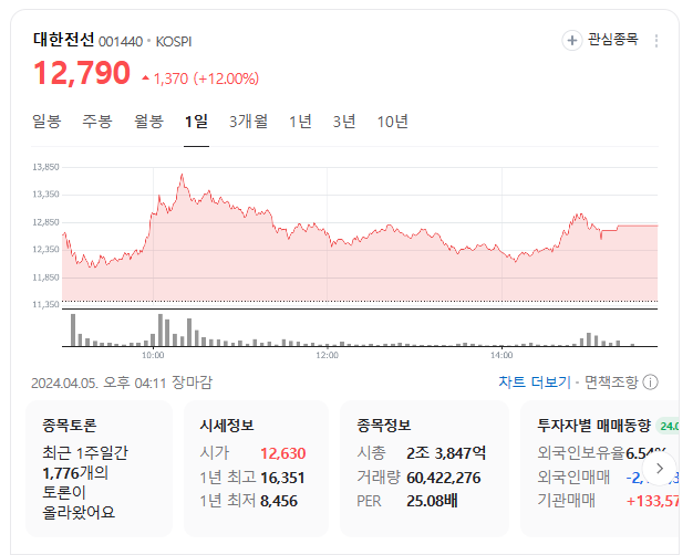 이 글에서는 대한전선 주가 전망과 목표 주가, 기업 정보에 대해서 설명합니다. 주식 시장에서 핵심은 미래의 기업 가치를 예측하고 선제적으로 움직이는 것입니다. 투자할 종목을 선택하기 전에 현재 기업의 현황과 데이터를 확인하는 것이 필요합니다. 대한전선 주식의 주요 현황과 투자 정보를 확인하시고 주식 투자에 유용한 정보들을 모아두었으니 투자 결정에 도움을 받으실 수 있을 것입니다.