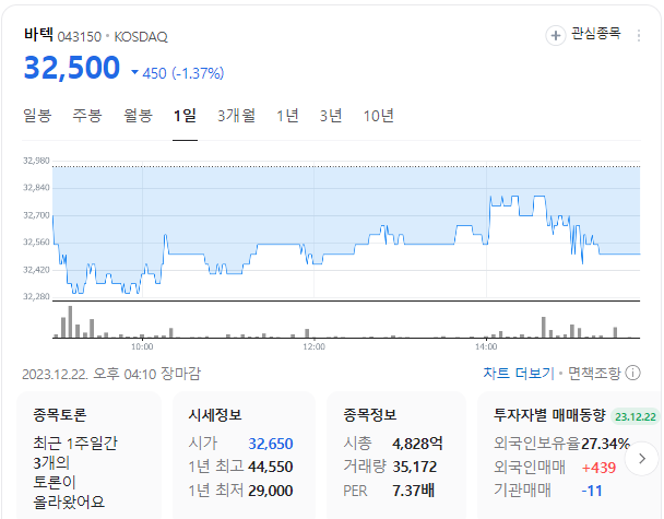 바텍 현재 주가는 32,500원이며 전일 대비 -450원의 모습을 보이고 있습니다. 바텍의 주주현황을 살펴보면 바텍이우홀딩스(외 4인)이 지분 53.65%를 소유하고 있습니다. 바텍는 의료 장비 및 서비스 기업으로 장중 기준으로 주가는 32,500원 입니다. 삼성전자의 시가 총액은 4828억 원이며 발행 주식수는 27.34주 입니다. 외국인 보유 비중은 35,172% 이며 장중 거래량은 14,854,256를 기록했습니다. 매출액은 2,806억 원, 영업이익은 796억 원을 달성했습니다. EPS는 4,440원이며 바텍 주식 배당수익률은 4,245,516% 입니다.