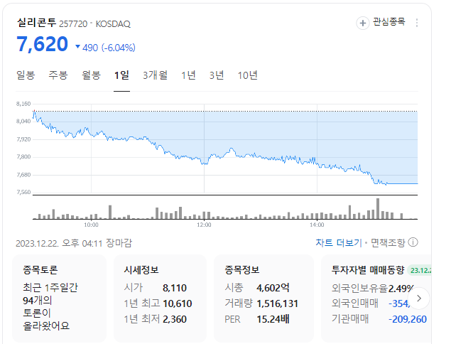 실리콘투 현재 주가는 7,620원이며 전일 대비 -490원의 모습을 보이고 있습니다. 실리콘투의 주주현황을 살펴보면 김성운(외 7인)이 지분 45.06%를 소유하고 있습니다. 실리콘투는 온라인쇼핑 기업으로 장중 기준으로 주가는 7,620원 입니다. 삼성전자의 시가 총액은 4602억 원이며 발행 주식수는 2.49주 입니다. 외국인 보유 비중은 1,531,362% 이며 장중 거래량은 60,389,234를 기록했습니다. 매출액은 2,372억 원, 영업이익은 142억 원을 달성했습니다. EPS는 614원이며 실리콘투 주식 배당수익률은 4,602% 입니다.