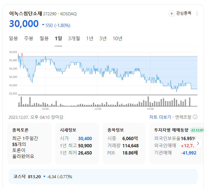 이녹스첨단소재 현재 주가는 30,550원이며 전일 대비 -3.63원의 모습을 보이고 있습니다. 이녹스첨단소재의 주주현황을 살펴보면 이녹스(외 3인)이 지분 30.82%를 소유하고 있습니다. 이녹스첨단소재는 디스플레이 및 관련부품 기업으로 장중 기준으로 주가는 30,550원 입니다. 삼성전자의 시가 총액은 6060억 원이며 발행 주식수는 16.89주 입니다. 외국인 보유 비중은 130,614% 이며 장중 거래량은 20,201,658를 기록했습니다. 매출액은 3,034억 원, 영업이익은 971억 원을 달성했습니다. EPS는 2,317원이며 이녹스첨단소재 주식 배당수익률은 1.49% 입니다.