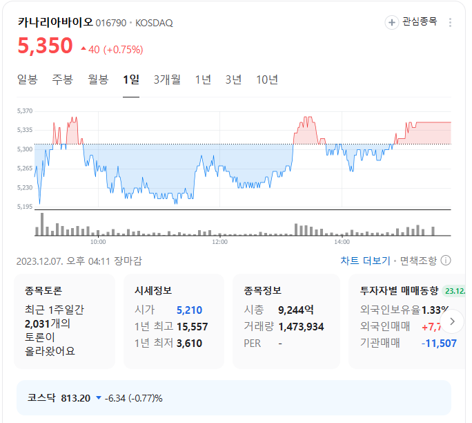카나리아바이오 현재 주가는 5,310원이며 전일 대비 -51.82원의 모습을 보이고 있습니다. 카나리아바이오의 주주현황을 살펴보면 카나리아바이오엠(외 7인)이 지분 56.96%를 소유하고 있습니다. 카나리아바이오는 식료품 기업으로 장중 기준으로 주가는 5,310원 입니다. 삼성전자의 시가 총액은 9244억 원이며 발행 주식수는 1.33주 입니다. 외국인 보유 비중은 2,294,240% 이며 장중 거래량은 180,054,164를 기록했습니다. 매출액은 1,216억 원, 영업이익은 -22억 원을 달성했습니다. EPS는 없음원이며 카나리아바이오 주식 배당수익률은 888,432% 입니다.
