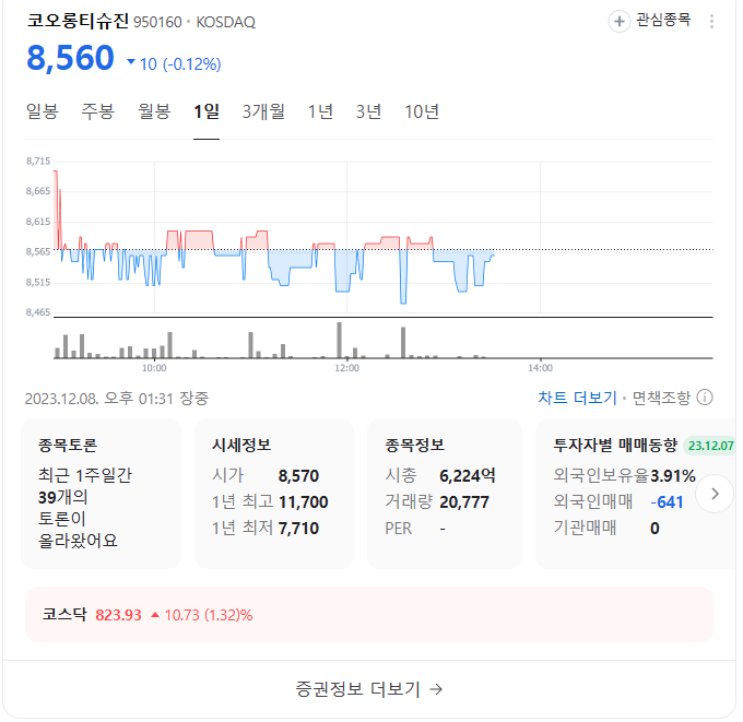 코오롱티슈진 현재 주가는 8,570원이며 전일 대비 -10원의 모습을 보이고 있습니다. 코오롱티슈진의 주주현황을 살펴보면 코오롱(외 7인)이 지분 67.98%를 소유하고 있습니다. 코오롱티슈진는 바이오 기업으로 장중 기준으로 주가는 8,570원 입니다. 삼성전자의 시가 총액은 6187억 원이며 발행 주식수는 3.91주 입니다. 외국인 보유 비중은 23,527% 이며 장중 거래량은 72,705,495를 기록했습니다. 매출액은 29억 원, 영업이익은 -163억 원을 달성했습니다.