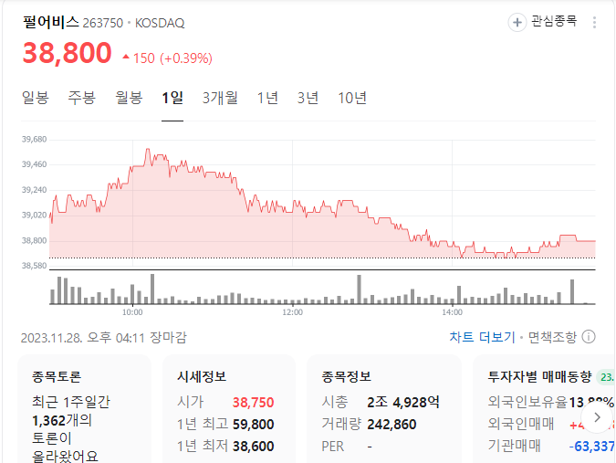 펄어비스, 5거래일 연속 하락에 4% 낙폭…3만9000원선 밑으로