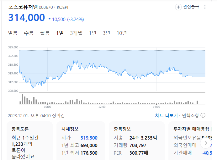 포스코퓨처엠 현재 주가는 314,000원이며 전일 대비 -10,500원의 모습을 보이고 있습니다. 포스코퓨처엠의 주주현황을 살펴보면 포스코홀딩스(외 4인)이 지분 62.54%를 소유하고 있습니다. 포스코퓨처엠는 화학 기업으로 장중 기준으로 주가는 314,000원 입니다. 삼성전자의 시가 총액은 24조3235억 원이며 발행 주식수는 5.43주 입니다. 외국인 보유 비중은 715,920% 이며 장중 거래량은 77,463,220를 기록했습니다. 매출액은 36,140억 원, 영업이익은 1,659억 원을 달성했습니다. EPS는 1,696원이며 포스코퓨처엠 주식 배당수익률은 0.17% 입니다.