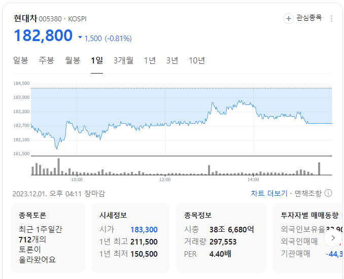 현대차 현재 주가는 182,800원이며 전일 대비 -1,500원의 모습을 보이고 있습니다. 현대차의 주주현황을 살펴보면 현대모비스(외 9인)이 지분 29.68%를 소유하고 있습니다. 현대차는 자동차 기업으로 장중 기준으로 주가는 182,800원 입니다. 삼성전자의 시가 총액은 38조6680억 원이며 발행 주식수는 32.90주 입니다. 외국인 보유 비중은 304,309% 이며 장중 거래량은 211,531,506를 기록했습니다. 매출액은 1,210,311억 원, 영업이익은 98,198억 원을 달성했습니다. EPS는 45,353원이며 현대차 주식 배당수익률은 4.64% 입니다.