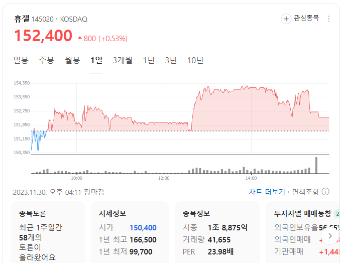이 글에서는 휴젤 주가 전망과 목표 주가, 기업 정보에 대해서 설명합니다. 주식 시장에서 중요한 것은 미래의 기업 가치를 예측하고 선제적으로 움직이는 것입니다. 투자할 종목을 고르기 전에 현재 기업의 현황과 데이터를 확인하는 것이 필요합니다. 휴젤 주식의 주요 현황과 투자 정보를 확인하시고 주식 투자에 도움이 될 만한 정보들을 모아 놓았으니 투자를 고려하실 때 참고하세요.