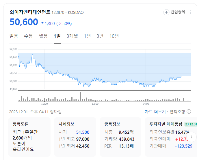 이 글에서는 와이지엔터테인먼트 YG 엔터테인먼트 주가 전망과 목표 주가, 기업 정보에 대해서 설명합니다. 주식 거래에서 중요한 부분은 현재 기업 가치보다는 미래의 기업 가치를 예측하고 먼저 행동하는 것입니다. 투자할 종목을 고르기 전에 현재 기업의 상황과 지표를 살펴보는 것이 중요합니다. 와이지엔터테인먼트 주식의 주요 현황과 투자 정보를 확인하시고 주식 투자에 도움이 될 만한 정보들을 모아 놓았으니 투자를 고려하실 때 참고하세요.